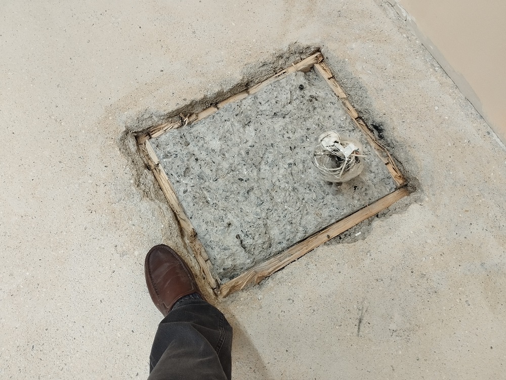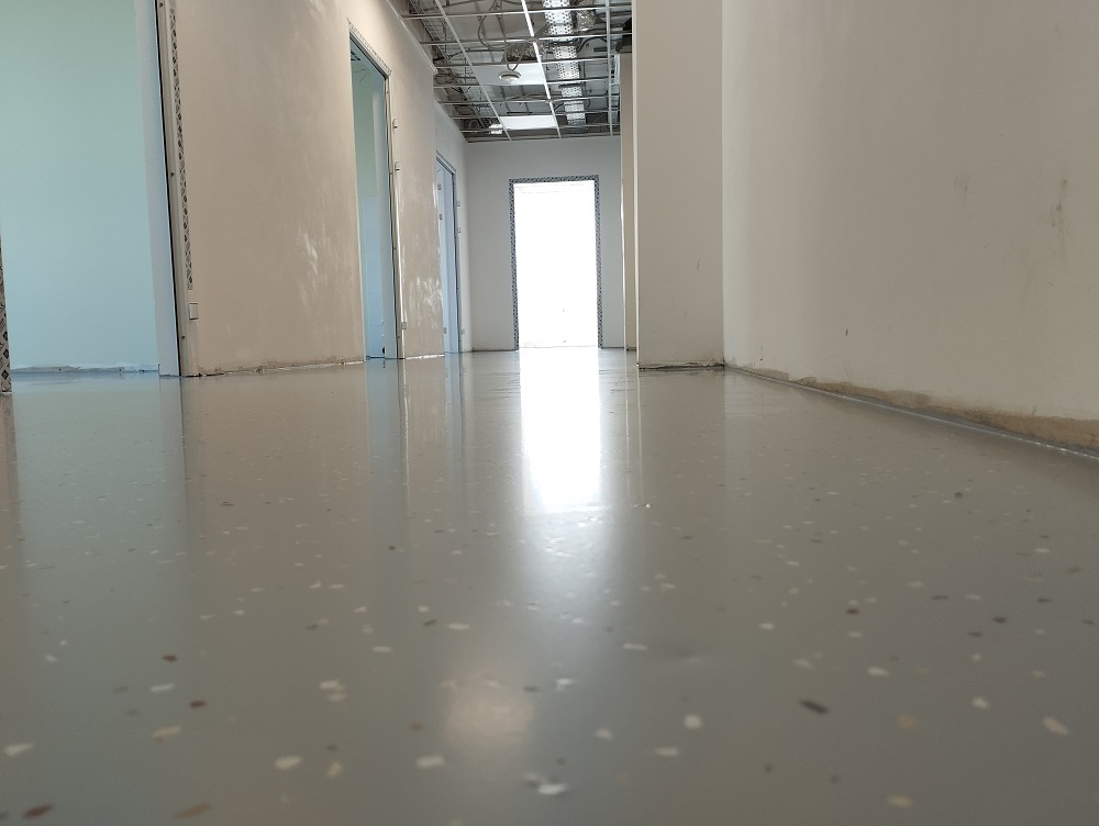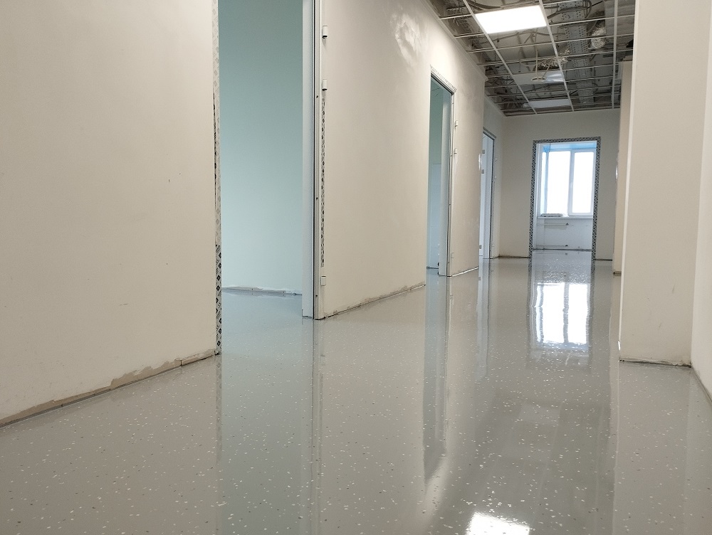 Офисное помещение коридор. Ремонт и восстановление бетонного пола после демонтажа керамогранитной плитки и устройство эпоксидного, бесшовного, декоративного с флоками покрытия пола