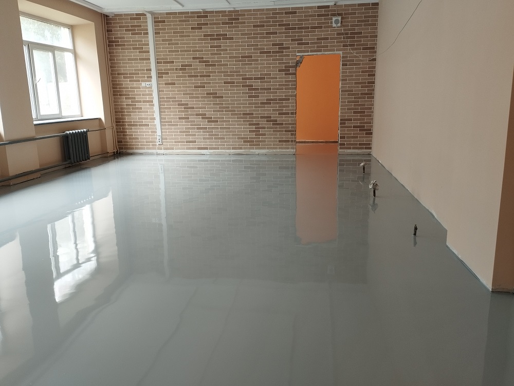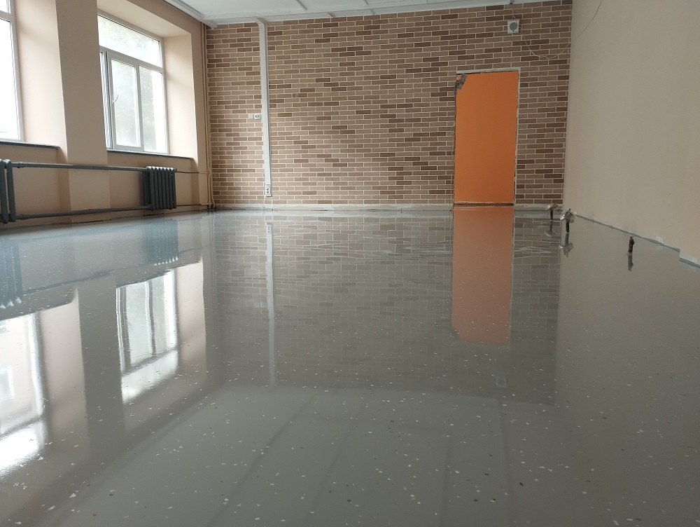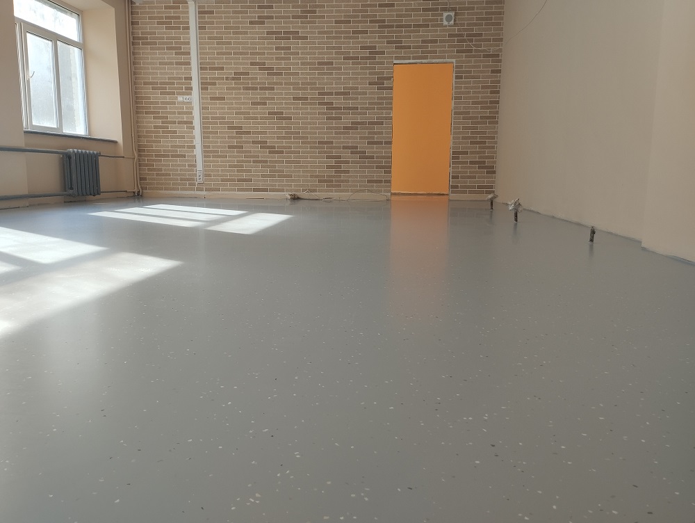 Школа №15 г.Челябинск. Кабинет технологии. Устройство полиуретанового (двухкомпонентного) покрытия бетонного пола с декоративными флоками