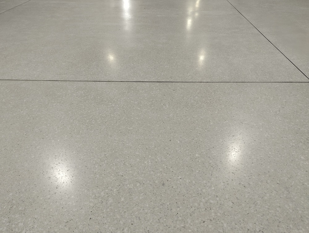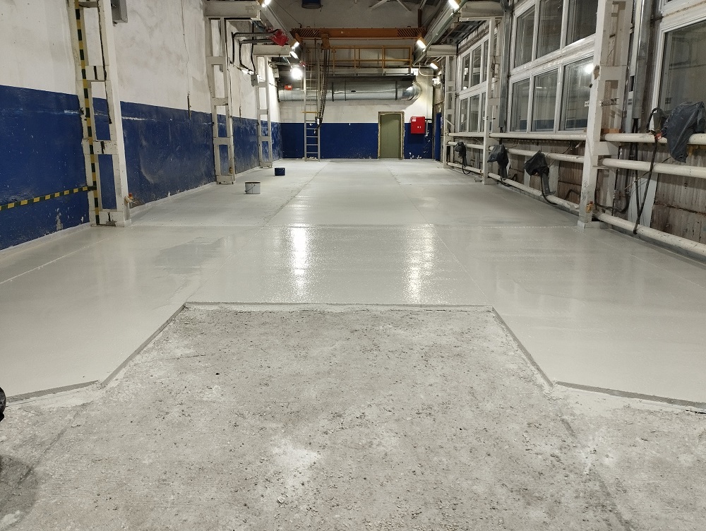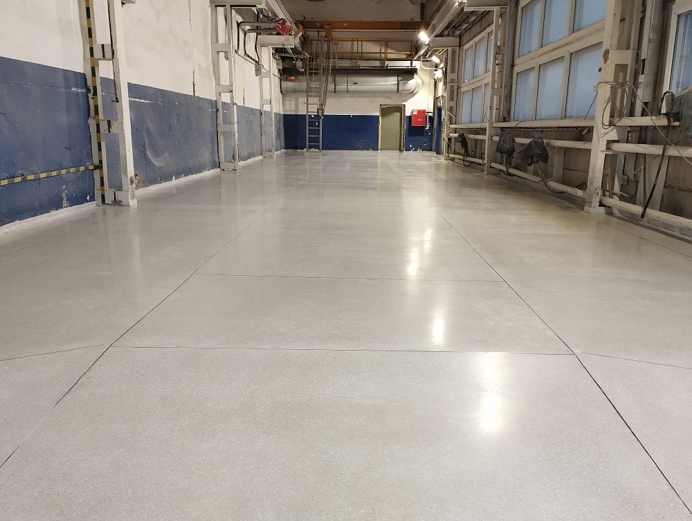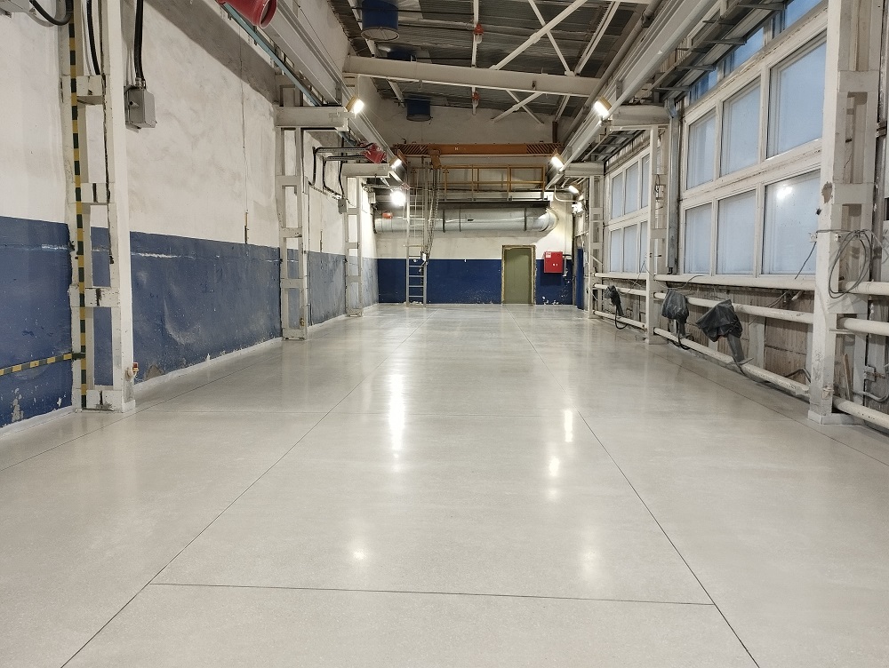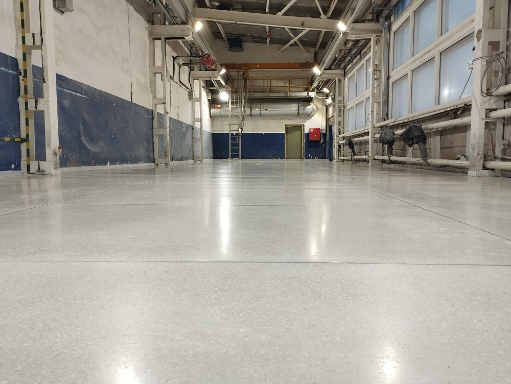 Реконструкция складского помещения АО "ТРАНСНЕФТЬ" Курганская область. Устройство высокопрочного, безискравого покрытия из белого портландцемента В40 типа "ТЕРРАЦЦО" наполнитель белый мрамор. |